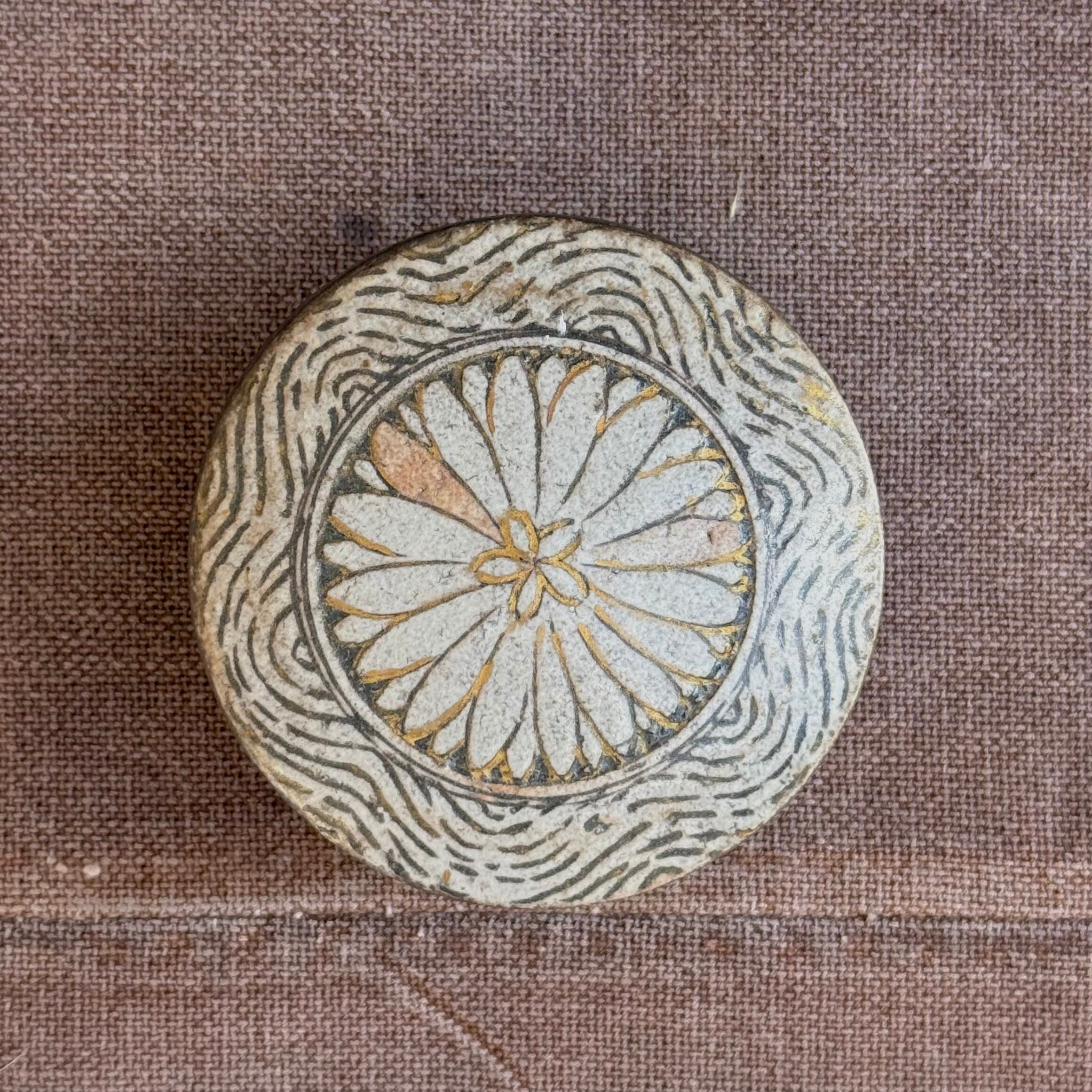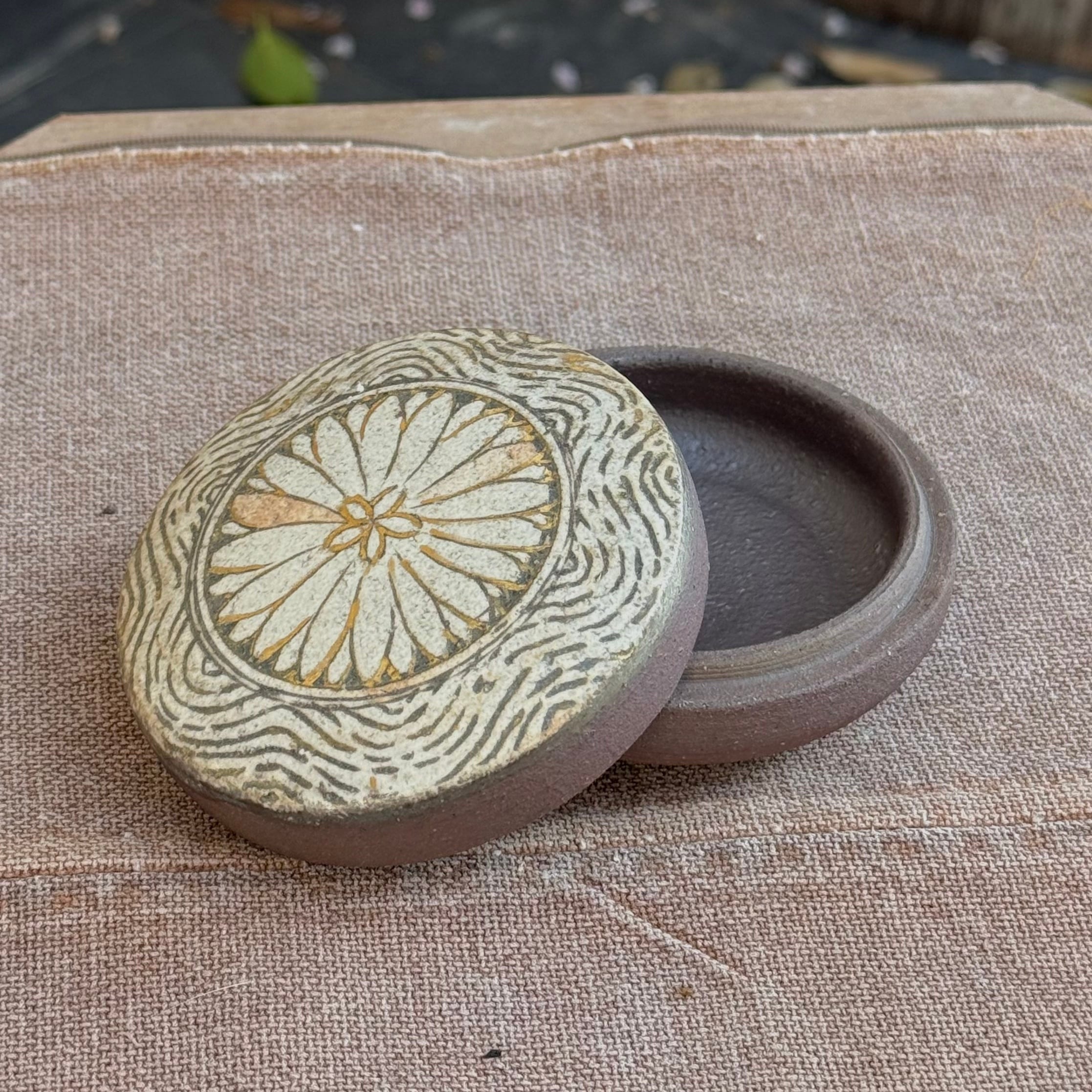 焼〆の香合です。彫文で花を描き、金彩をほどこしています。(香合とは茶道具のひとつで、香木や練香を入れる蓋つきの容器のことです)