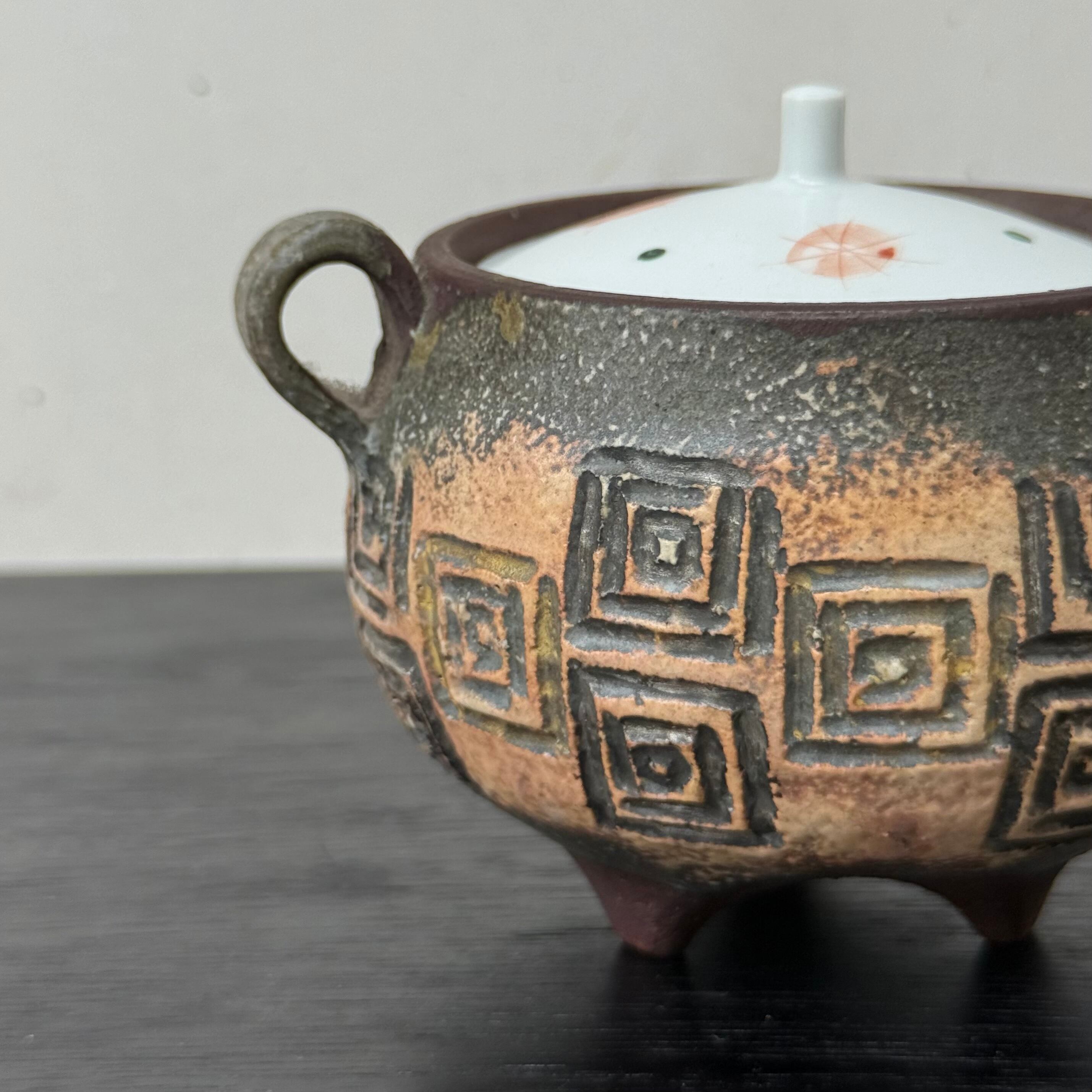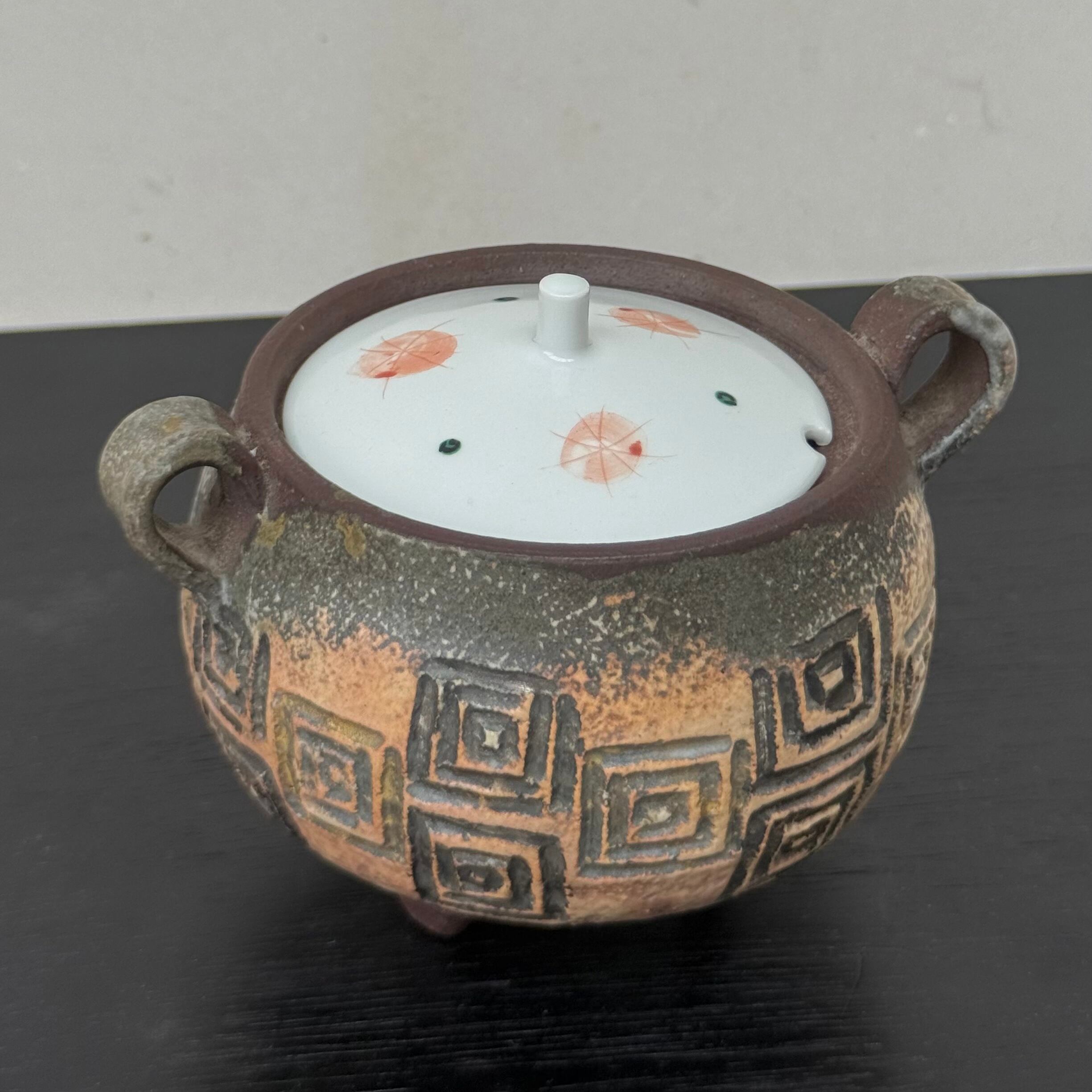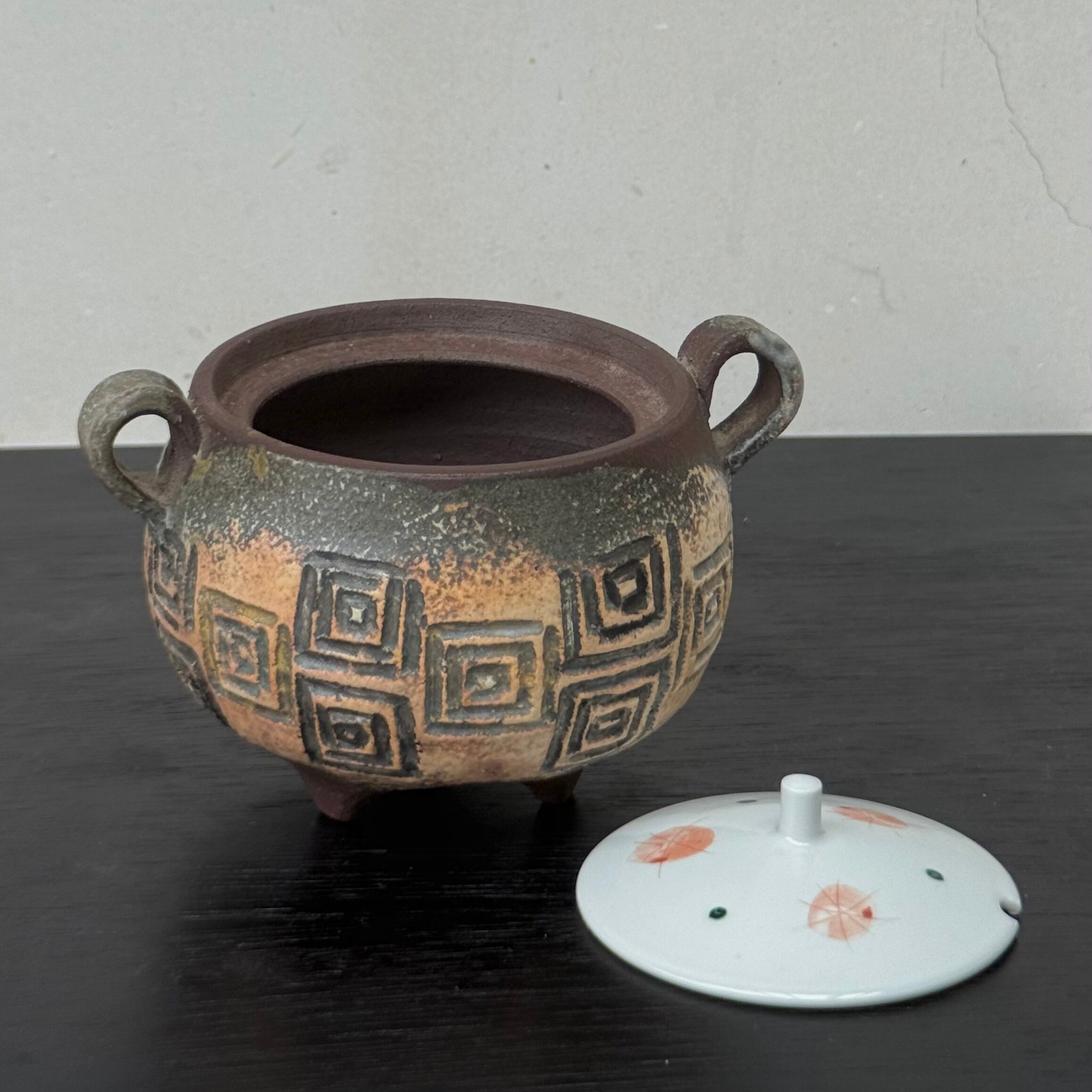 三つ足の焼〆香炉です。赤絵の蓋をおつけします。