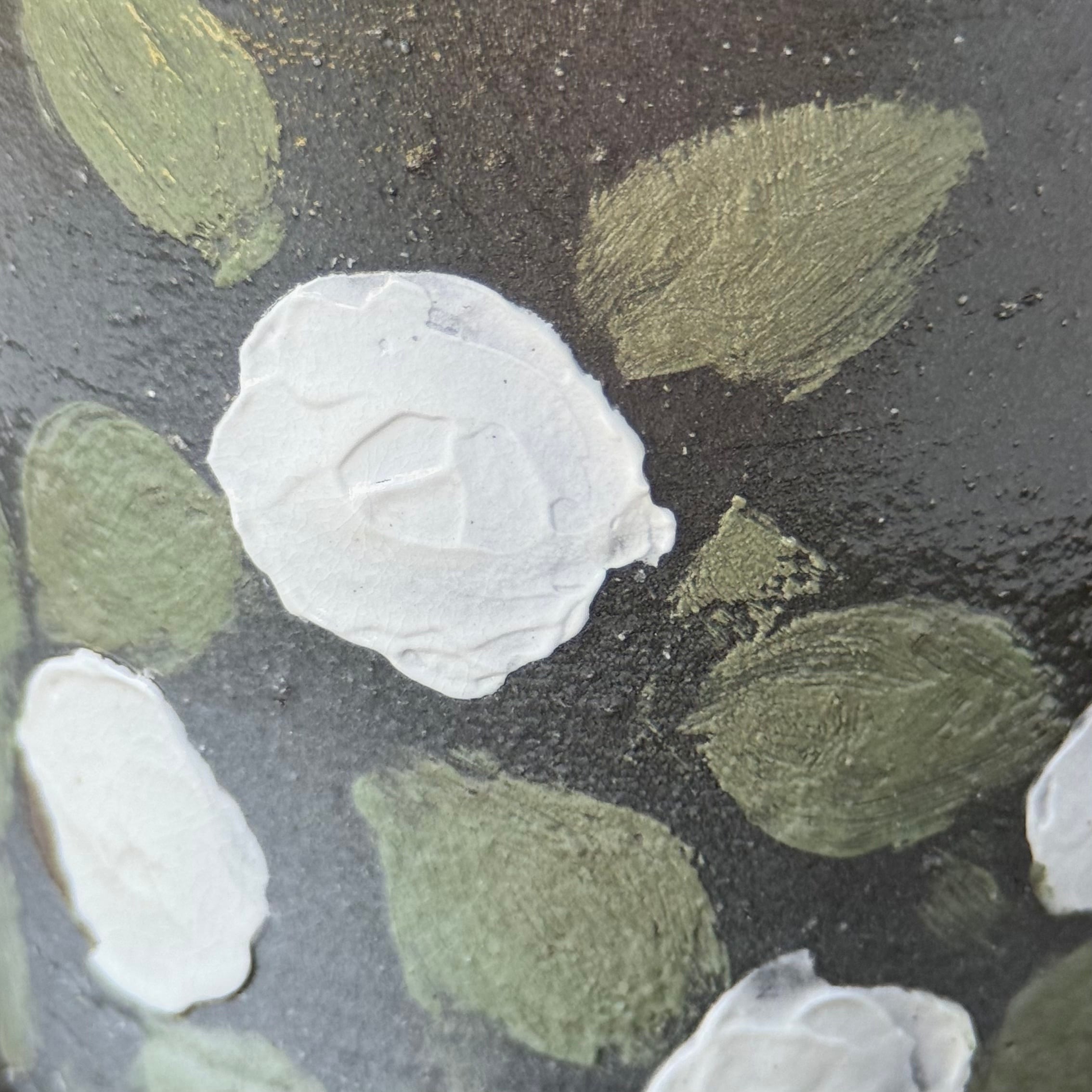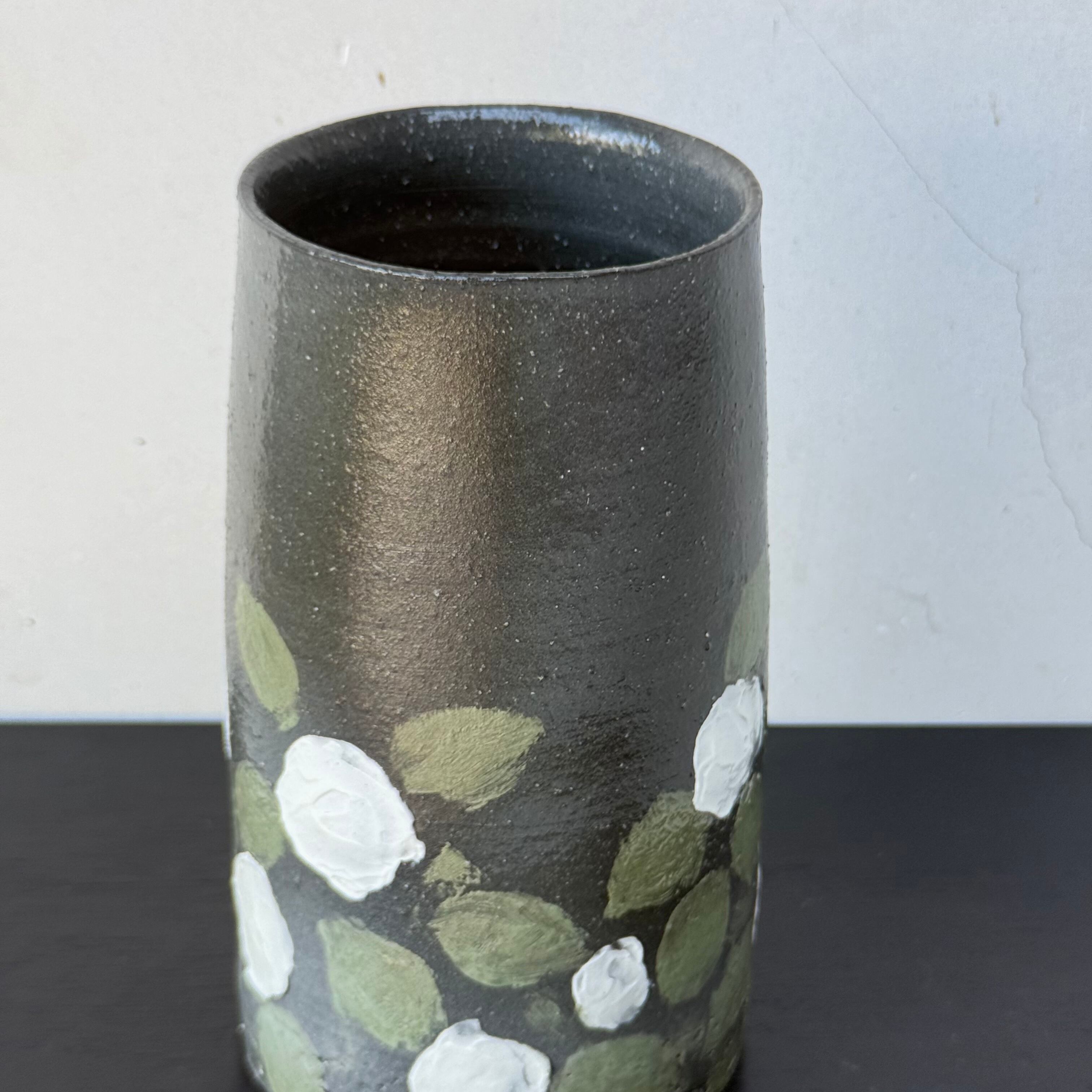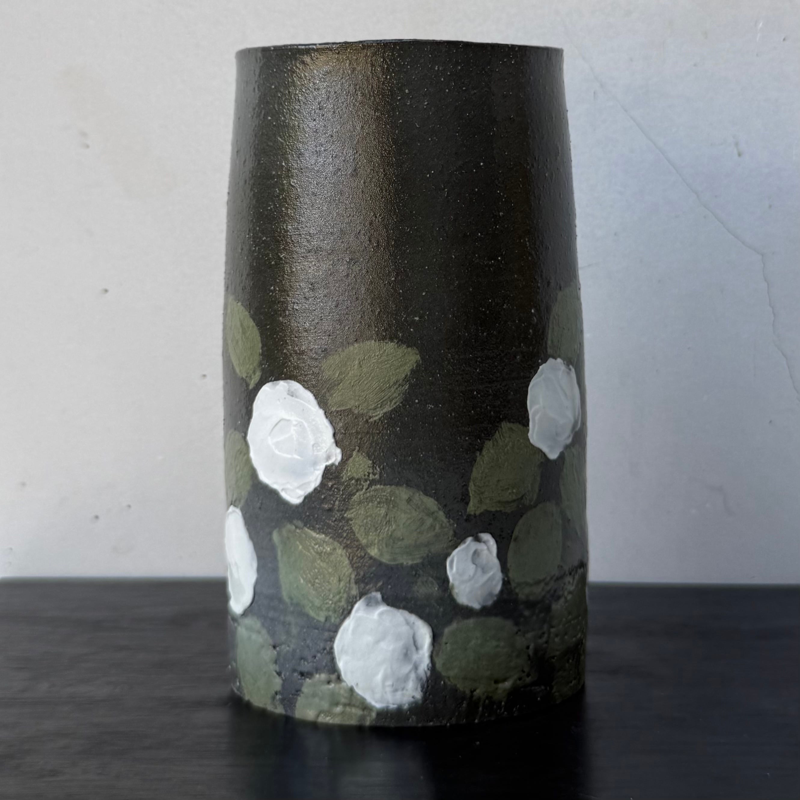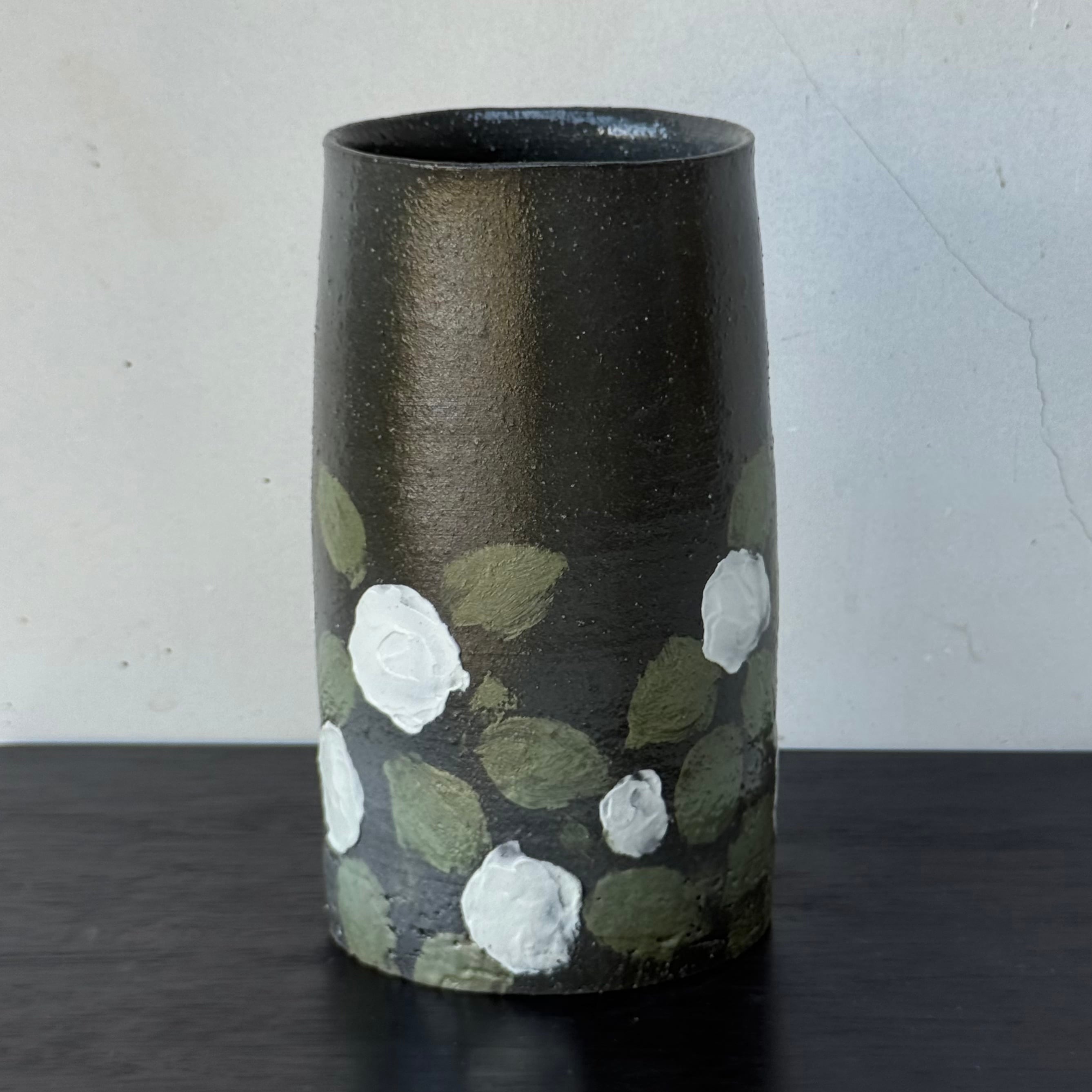 ヒマラヤの土で描いた白花がうつくしい黒釉の花入れです。