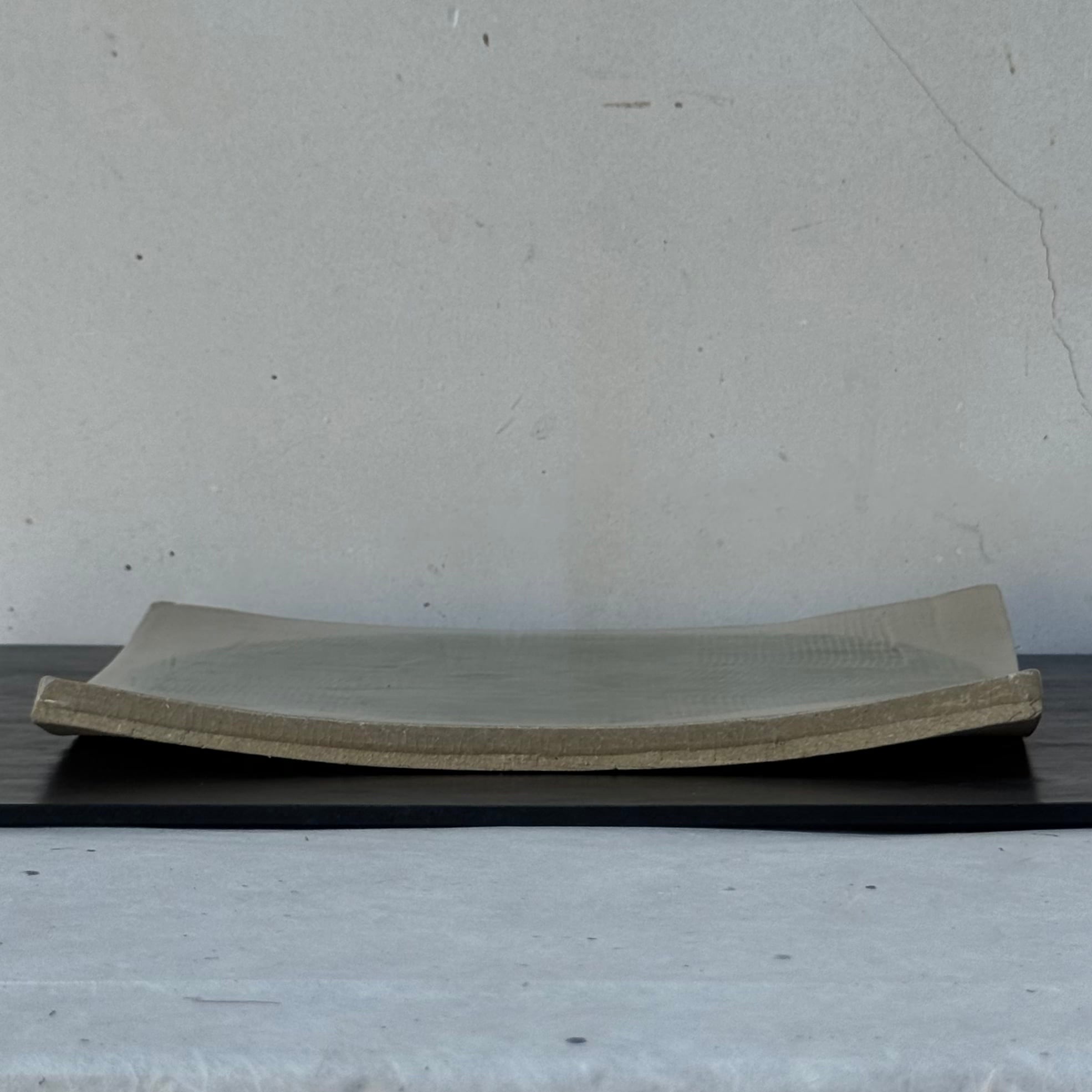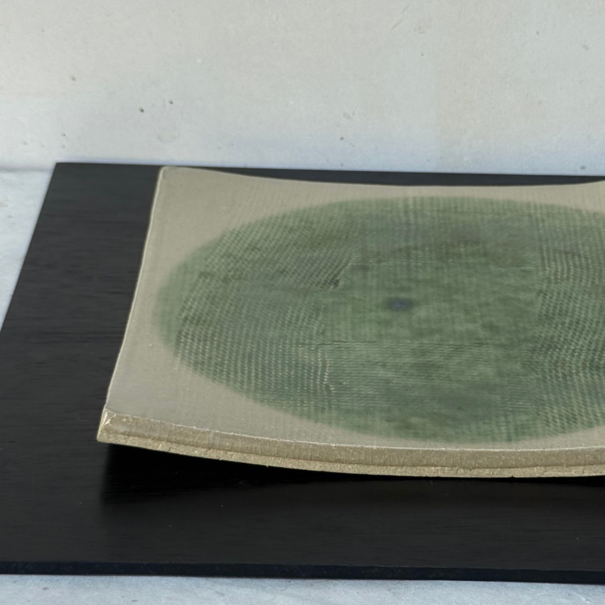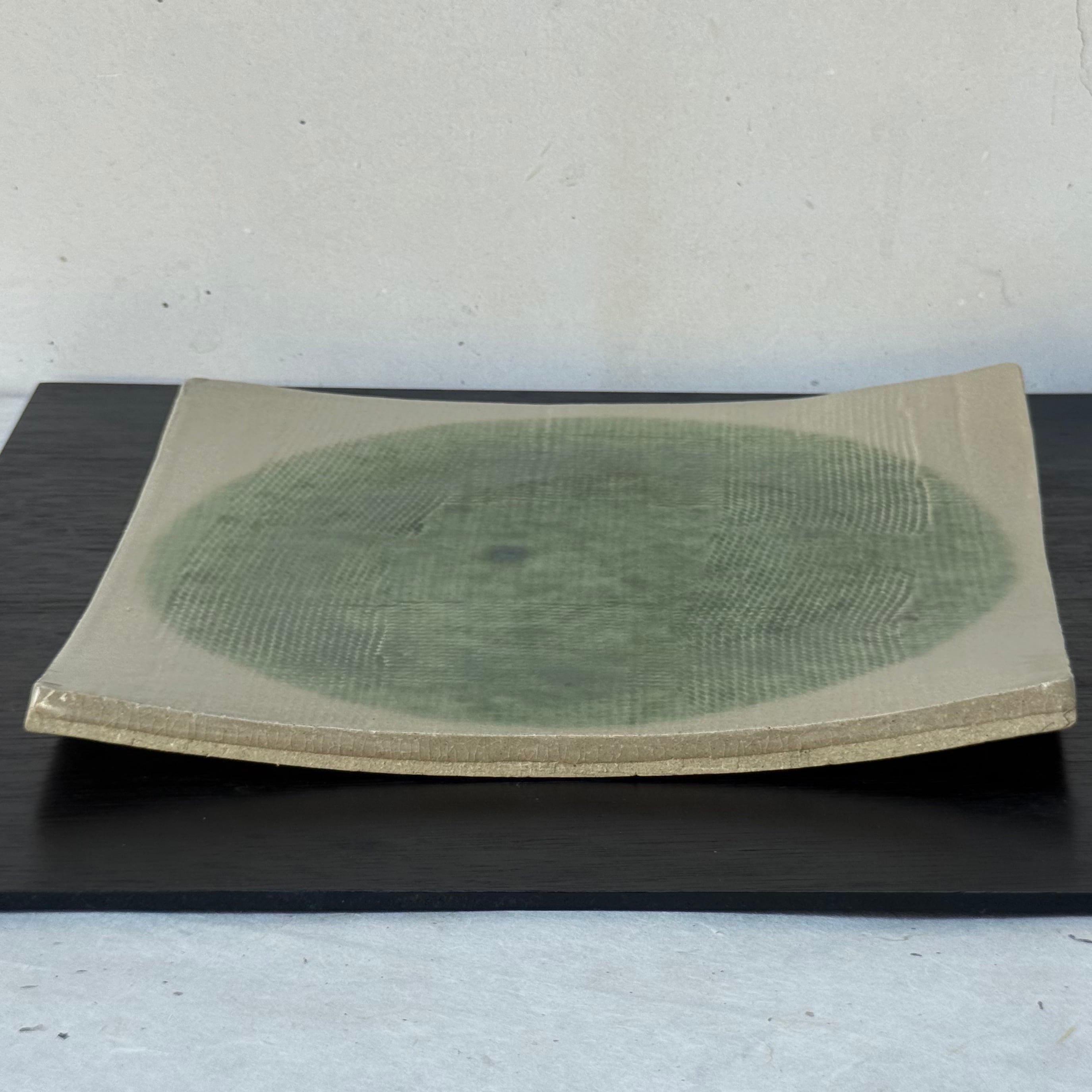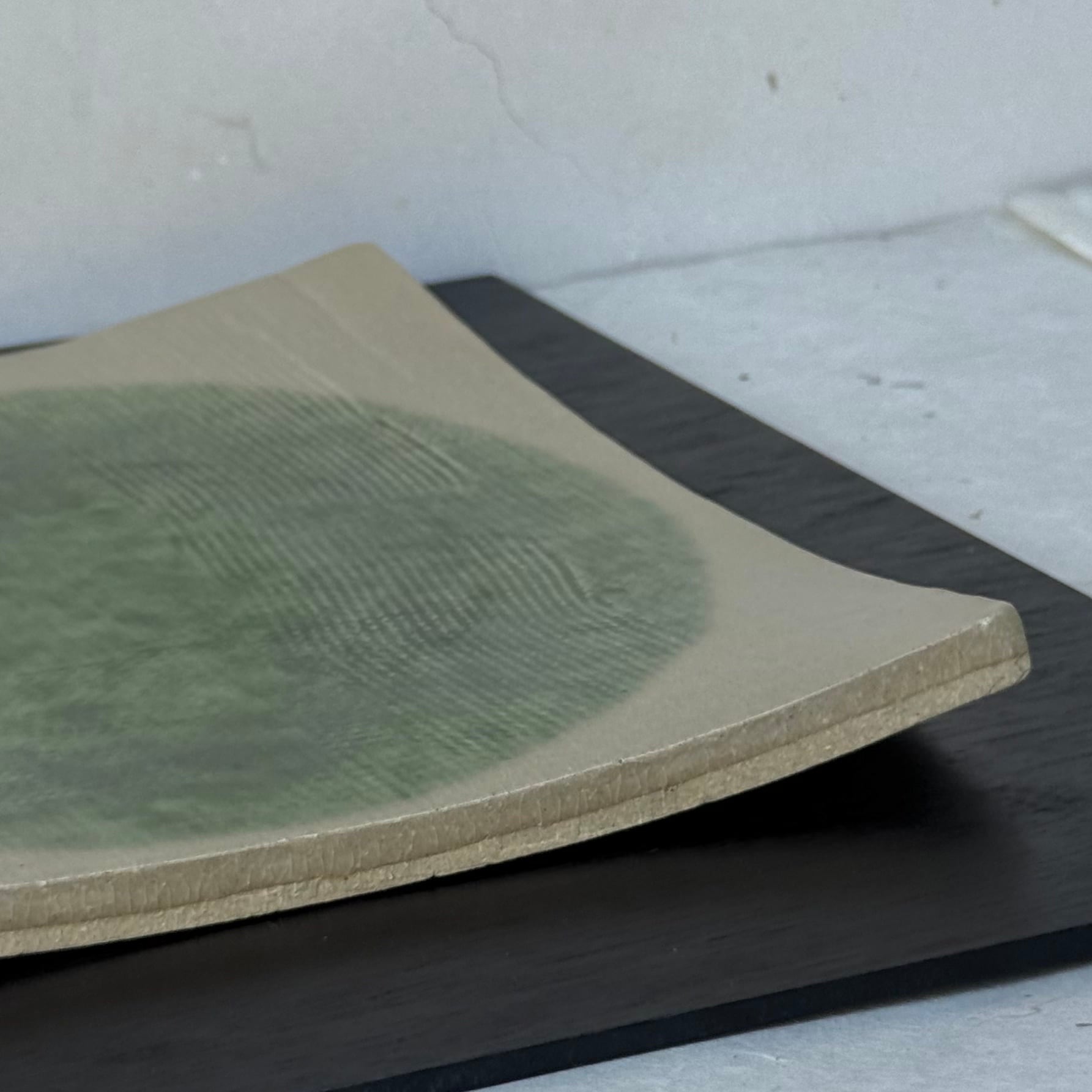 縁を丁寧に立ち上げた、緑の窓がうつくしい陶板皿です。