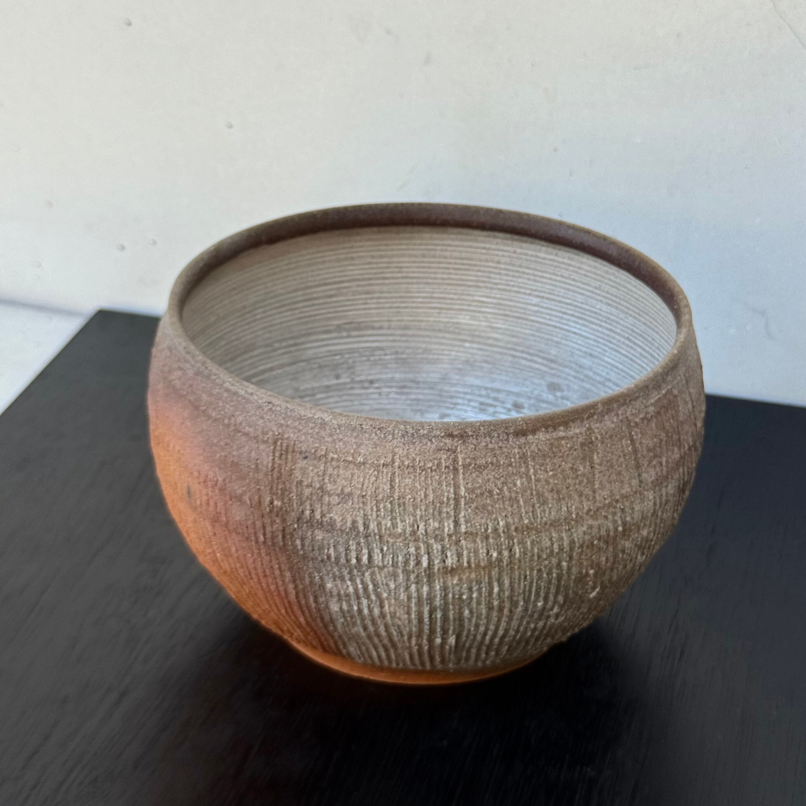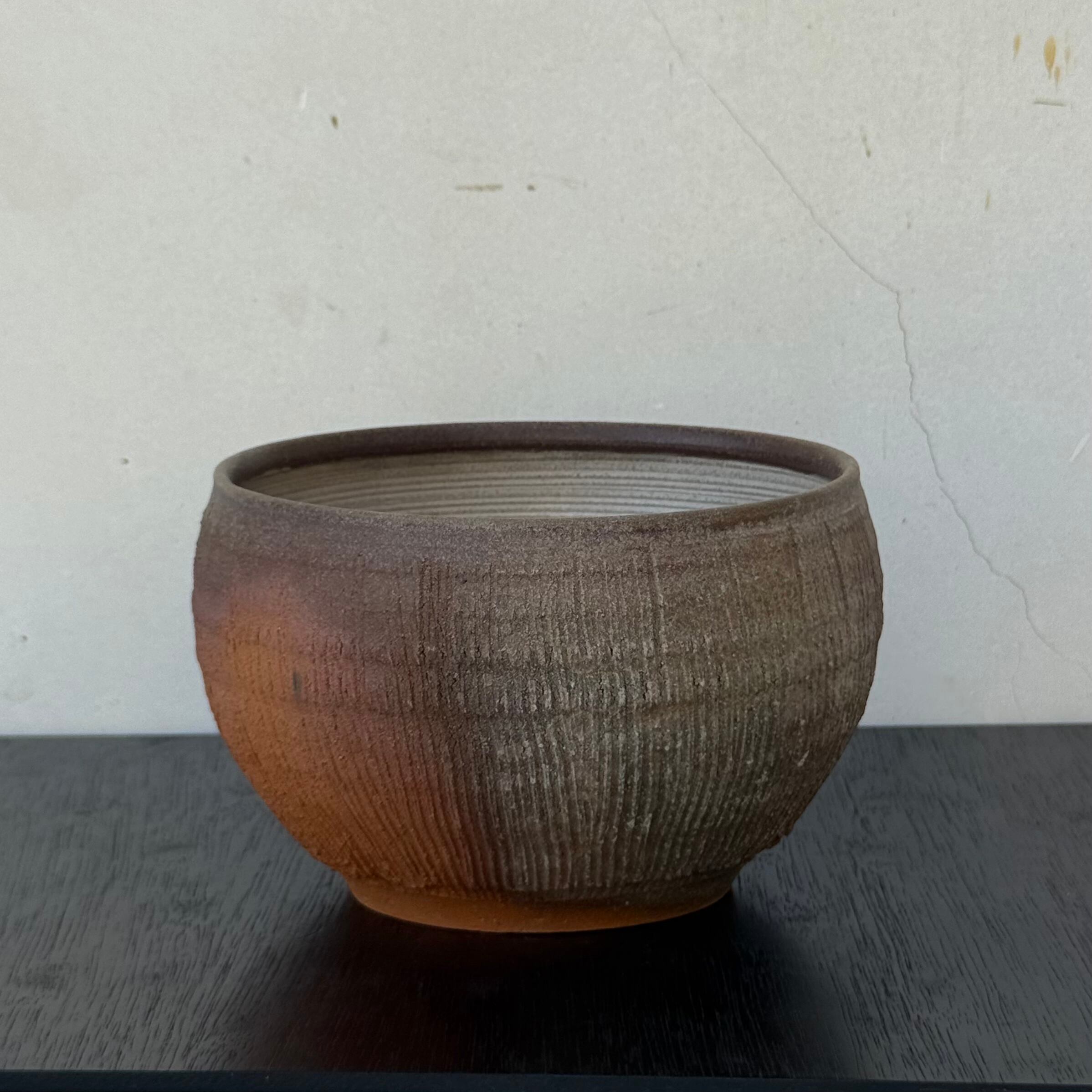 内に銀を巻き、櫛目をかざった鉢です。軟陶とは比較的低火度で焼成する技法のことです。